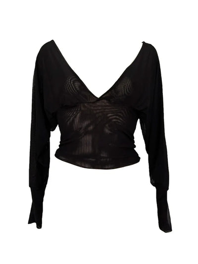 Bold, elegant, and effortlessly sexy—just like you. This long-sleeve black mesh top features a daring deep V neckline that strikes the perfect balance between sultry and sophisticated. Pair it with a mini skirt for a standout rave fit, or style it with wide-leg trousers for a chic night out with your girls. Crafted from soft, breathable mesh, it feels as good as it looks.